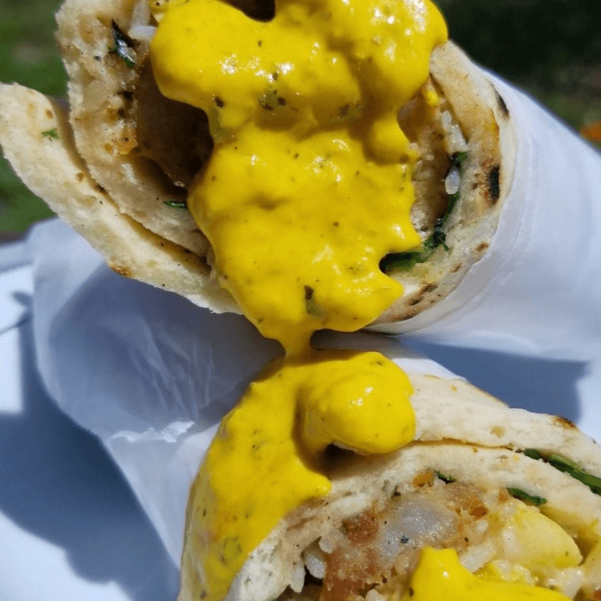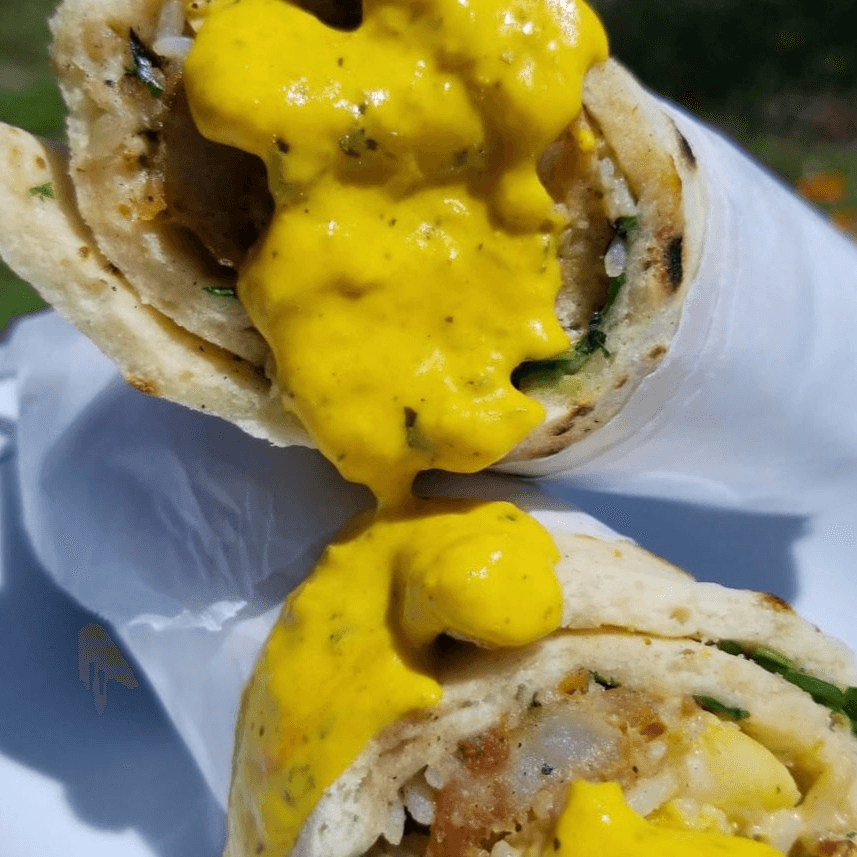 Shahi paneer, rice, and our sauces wrapped in a garlic naan.