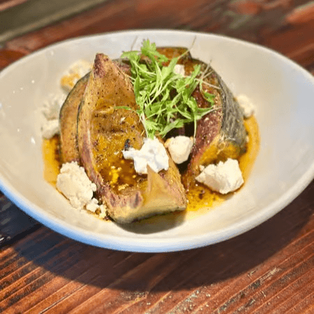 Roasted kabocha squash finished with house-made salsa matcha, black cumin, and chèvre
