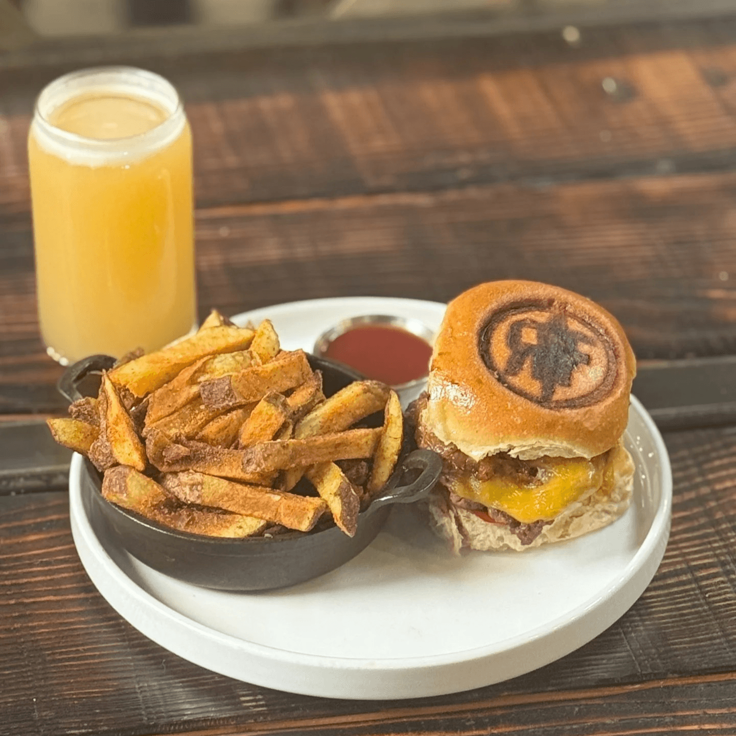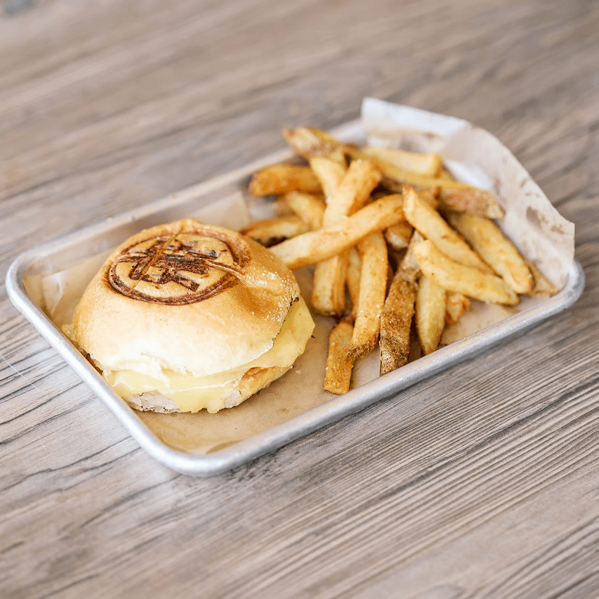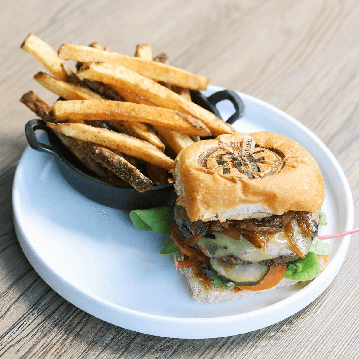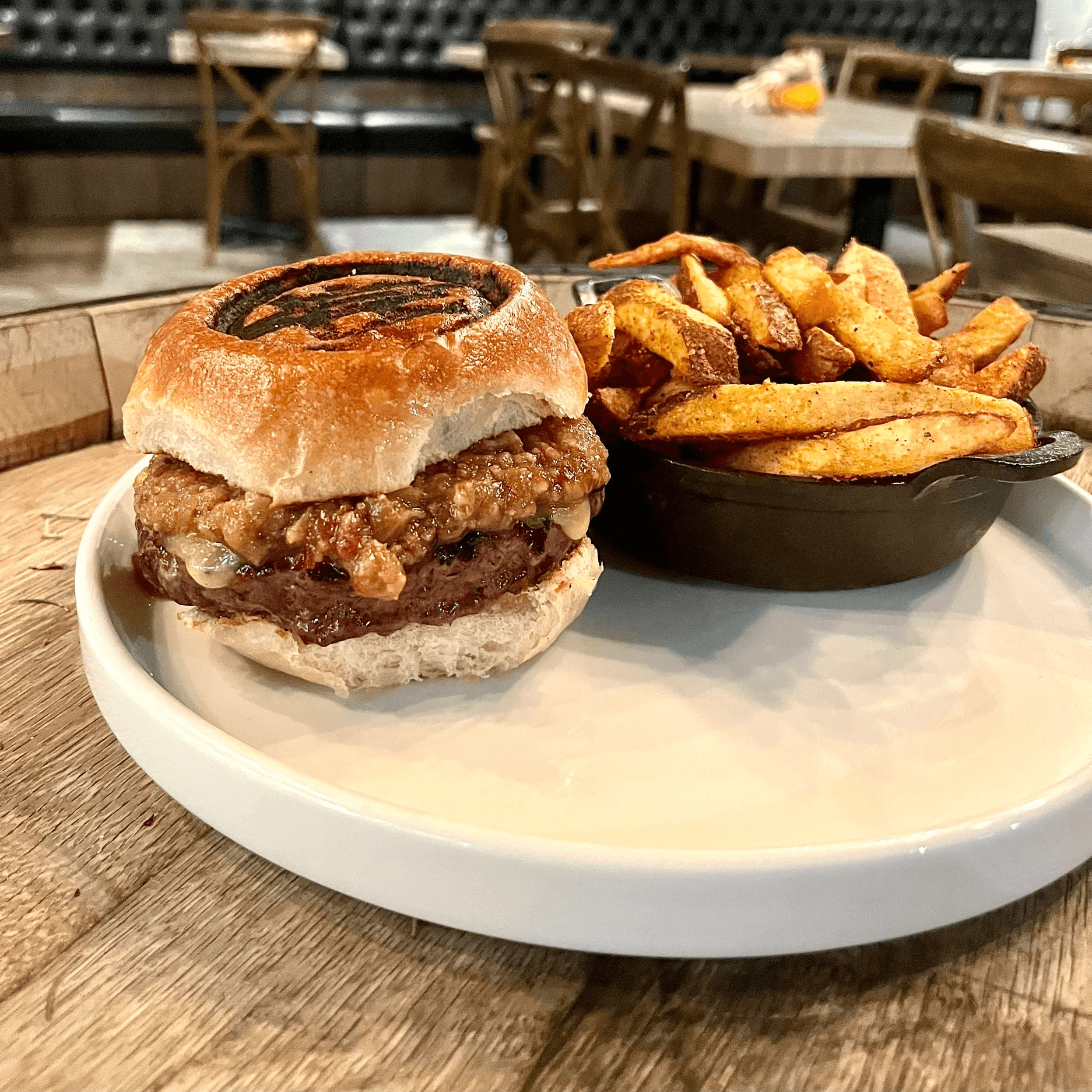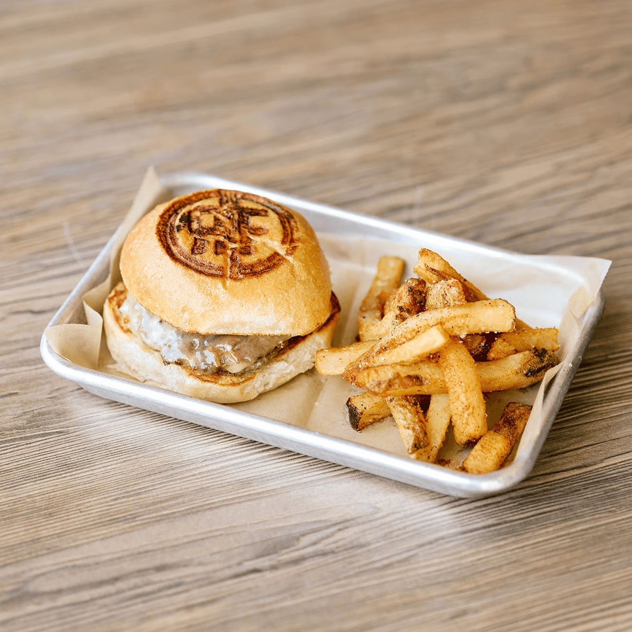 Melted Cheddar on a village bread potato bun, served with golden, house-made seasoned fries