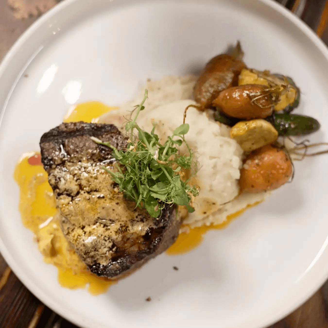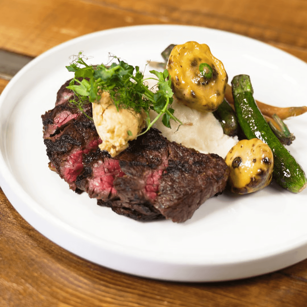 An 8-ounce, grass-fed Australian Wagyu sirloin BMS 7+ served with garlic mashed potatoes, local seasonal vegetables, and finished with house-made chili-tallow butter