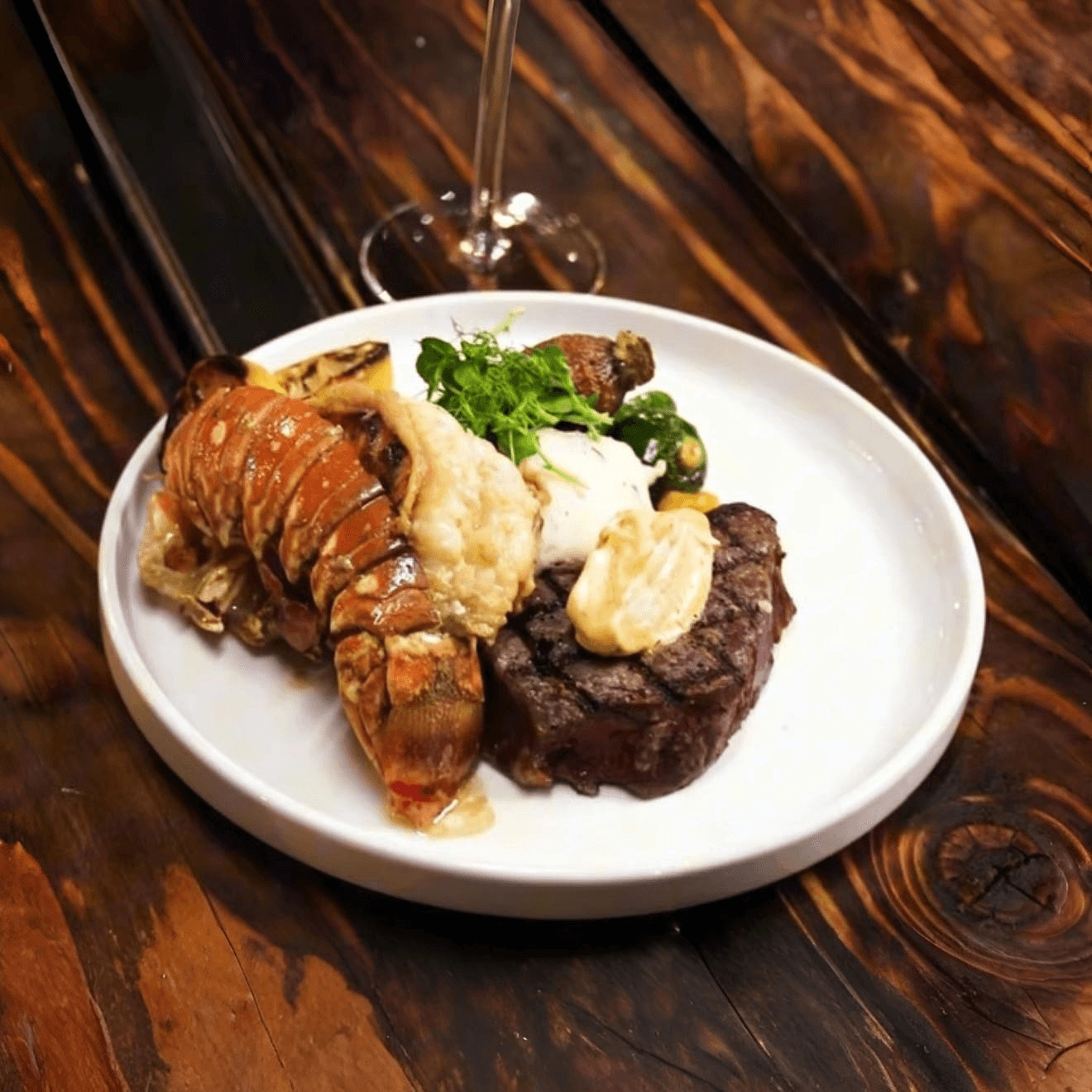 A 6-ounce, 100% grass-fed and finished Australian filet paired with a wild-caught lobster tail, served with garlic mashed potatoes, local seasonal vegetables, and finished with house-made chili-tallow butter