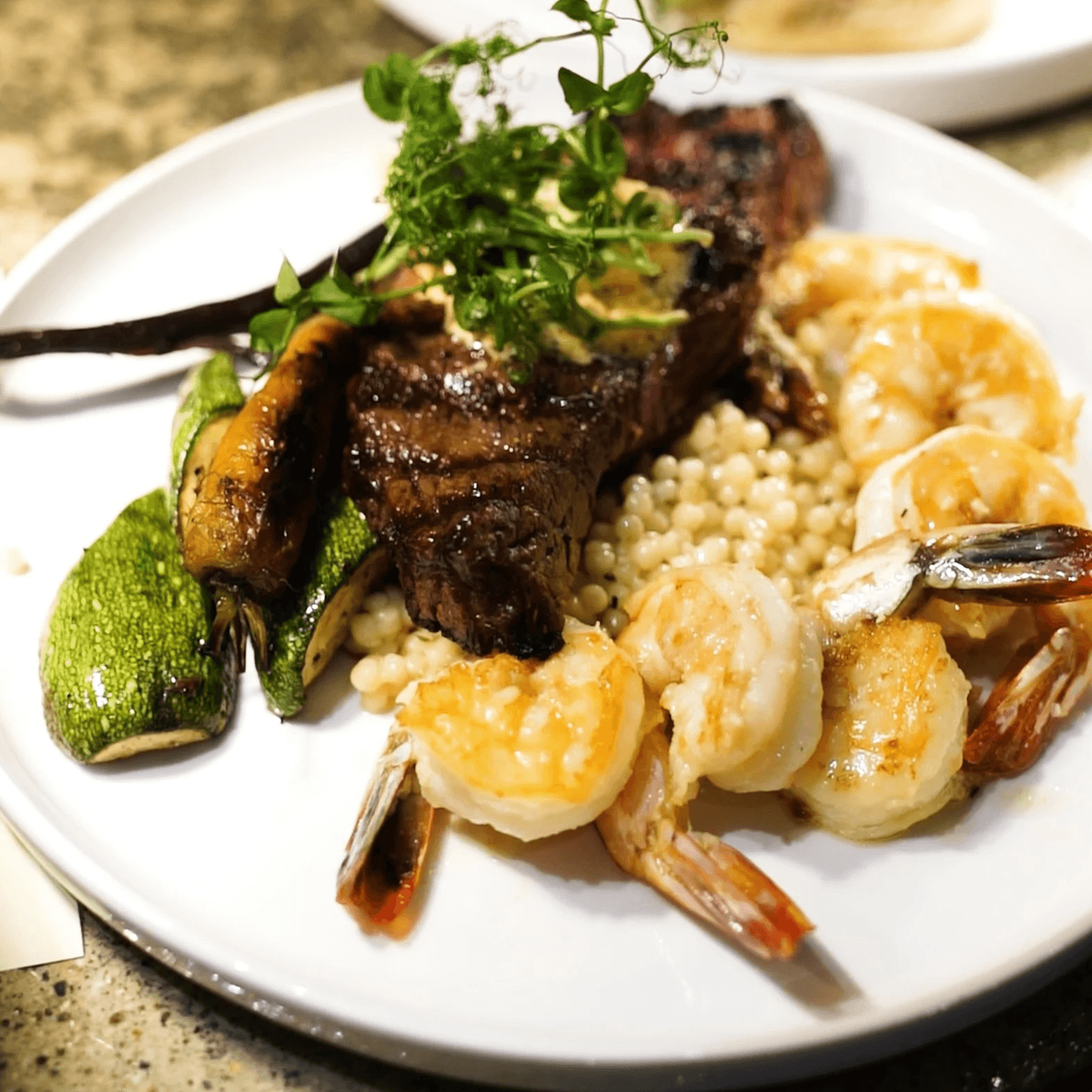 An 8-ounce, 100% grass-fed and finished Australian Wagyu sirloin BMS 7+ paired with wild-caught shrimp, served with couscous, local seasonal vegetables, and finished with chili-tallow butter