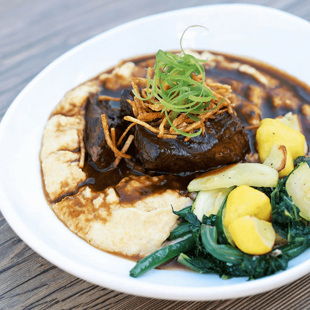 10-ounce 100% grass-fed and finished braised beef, served with garlic mashed potatoes and local seasonal vegetables, finished with a rich demi-glace