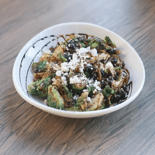 Crispy, locally grown brussels sprouts topped with Drake Family Farms goat cheese, wine-infused cranberries, and a drizzle of balsamic reduction