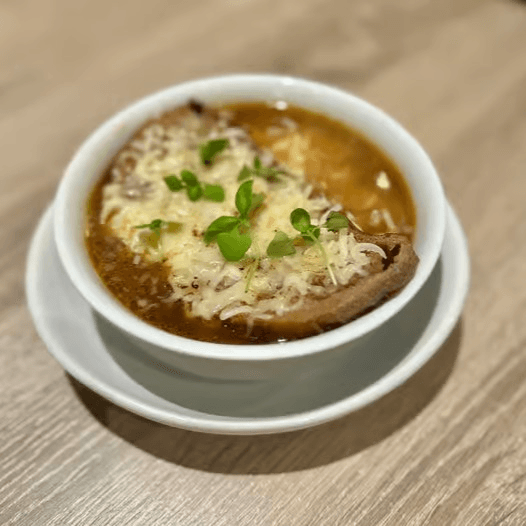 Beef stock simmered with tender short ribs and caramelized onions, finished with toasted sourdough and melted smoked cheddar cheese
