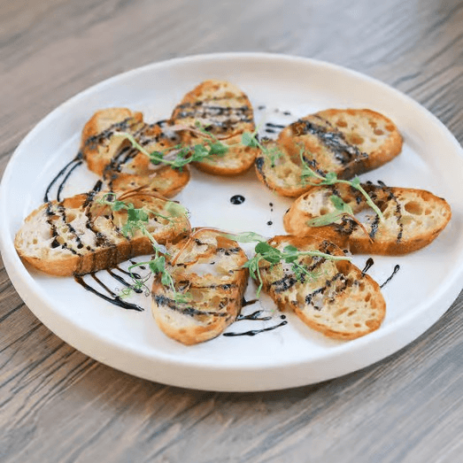 Freshly sliced baguette from Village Bakery, drizzled with roasted garlic olive oil and finished with balsamic reduction