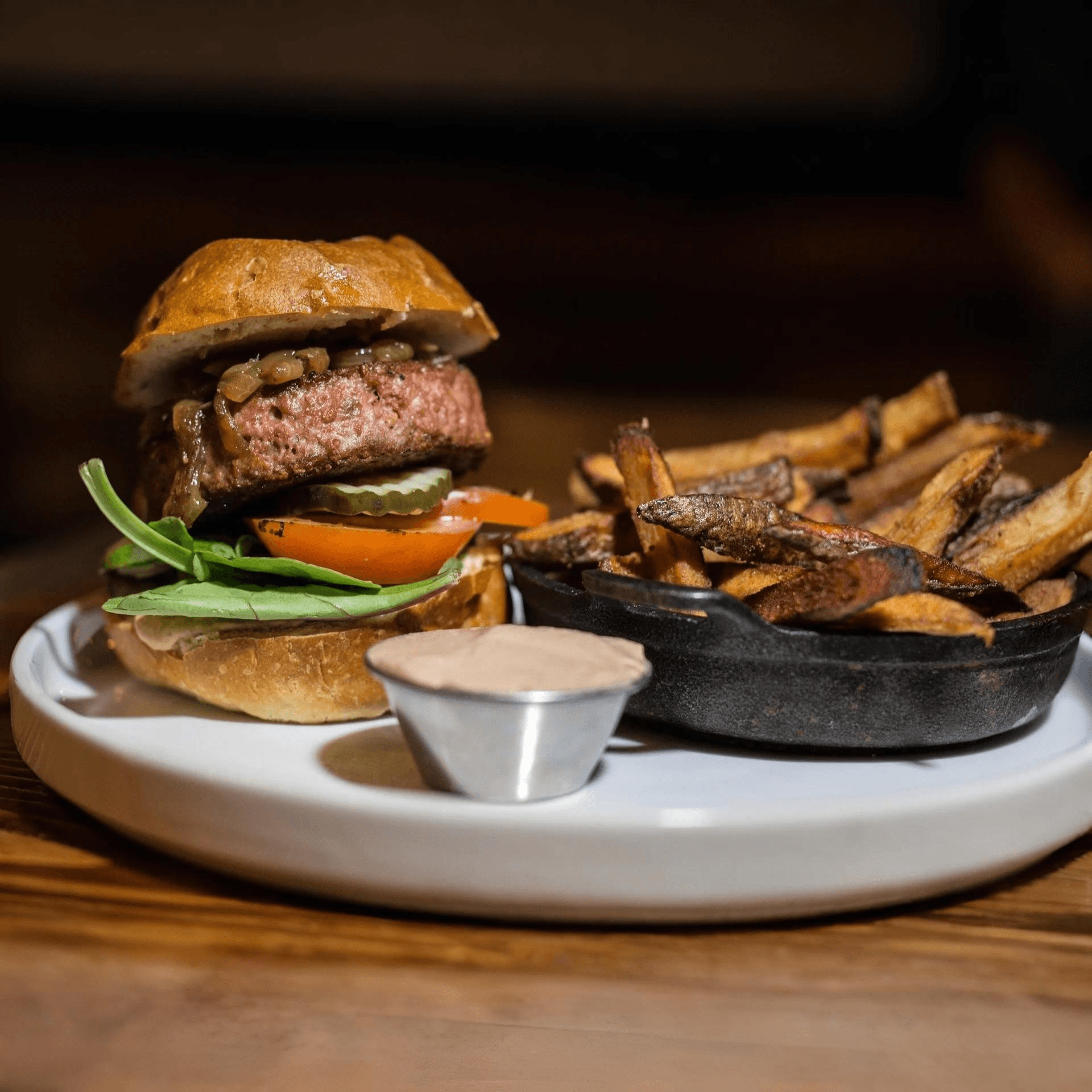 A 6-ounce, 100% grass-fed and finished Australian filet served with garlic mashed potatoes, local seasonal vegetables, and finished with house-made chili-tallow butter