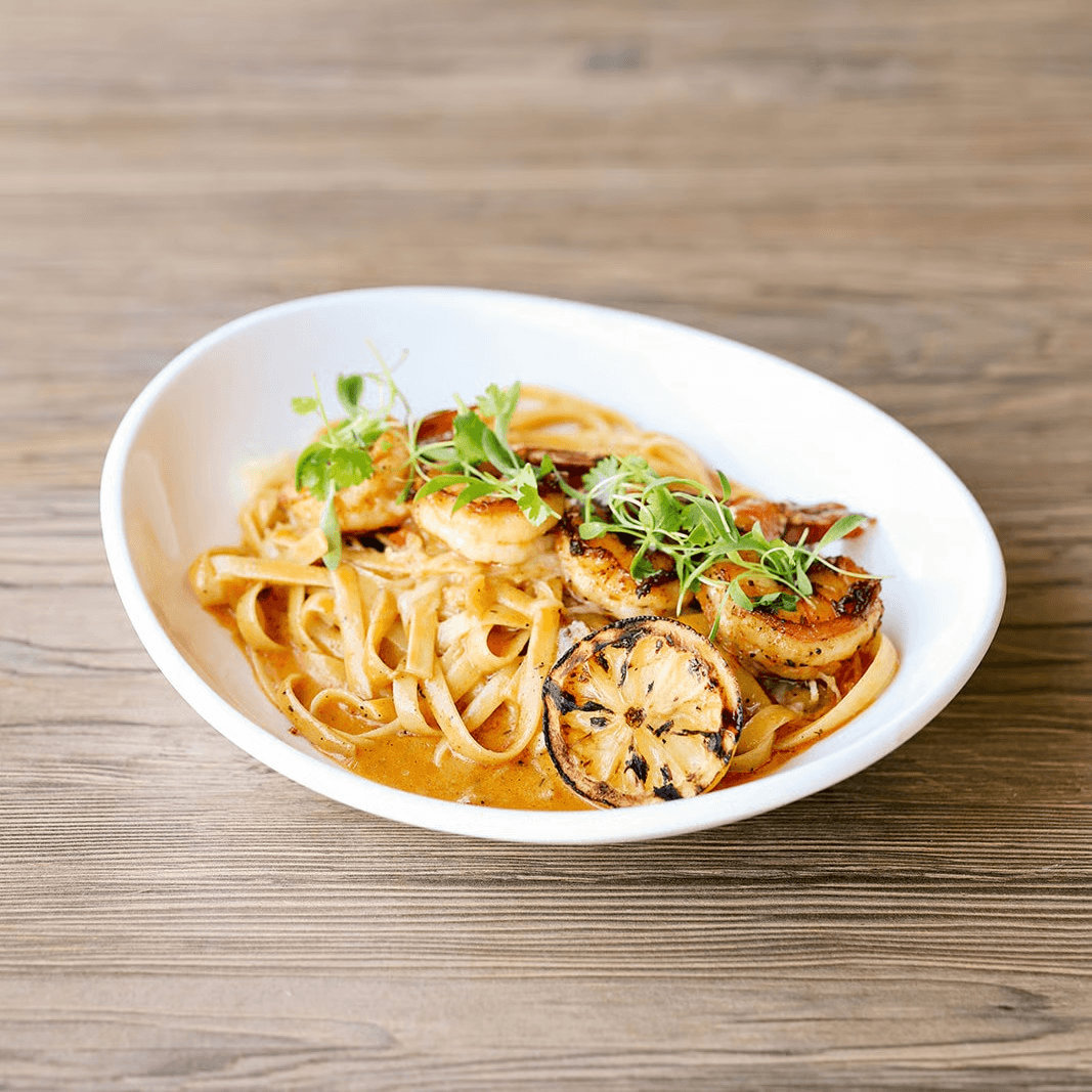 Cajun-spiced, wild-caught shrimp tossed with pappardelle in a rich house-made cream sauce with local tomatoes, onions, red peppers, and mushrooms, finished with Parmesan