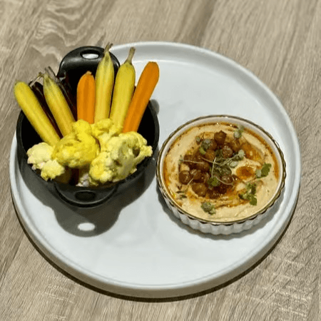 A medley of fresh seasonal vegetables and pickled cauliflower served with house-made hummus, topped with crispy chickpeas