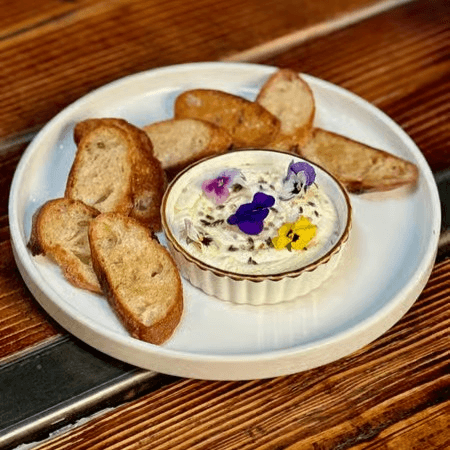 Creamy, whipped local Drake Family Farms goat cheese, lightly sweetened with Groovy Gopher lavender honey and finished with a touch of salt and dried lavender buds. Served with toasted Village Bakery baguette slices.