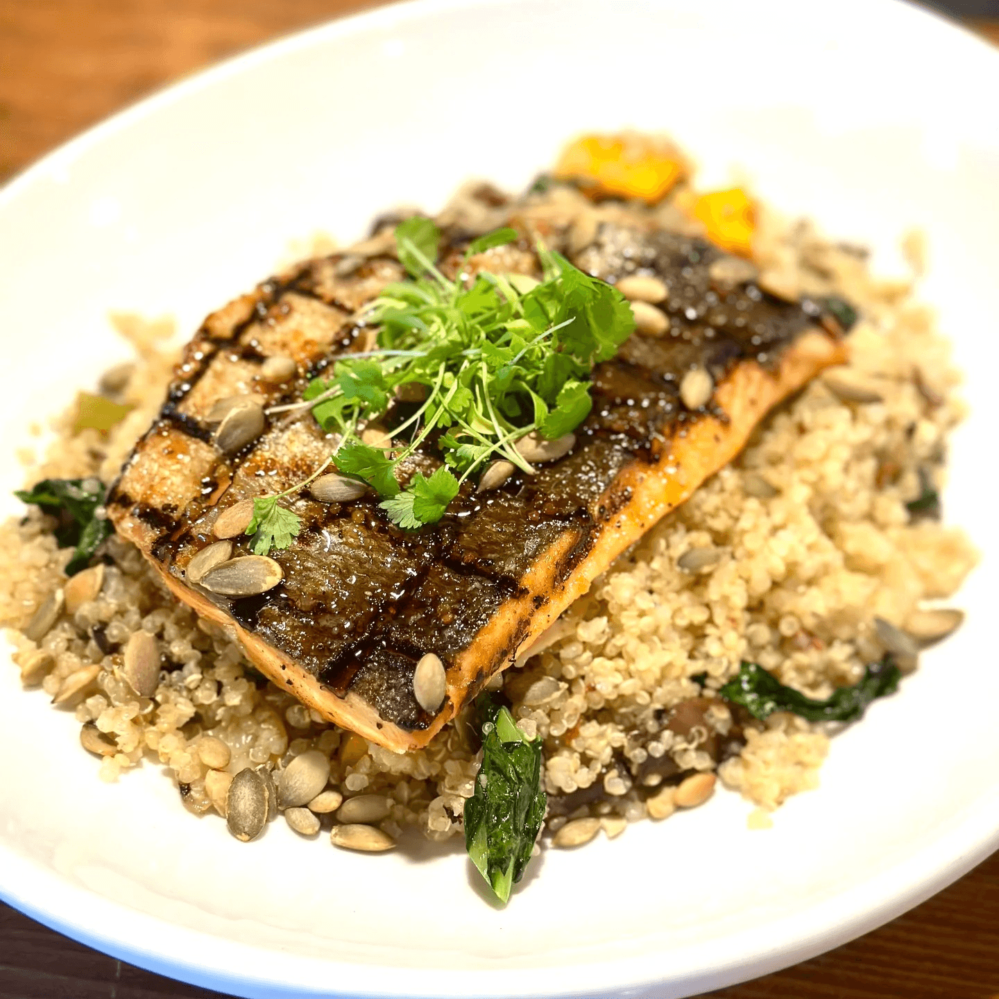 Grilled Wild Alaskan Sockeye Salmon fillet, served over a hearty bed of quinoa with sautéed mushrooms, roasted butternut squash, and organic kale. Finished with a grainy mustard and balsamic reduction for a rich tangy balance