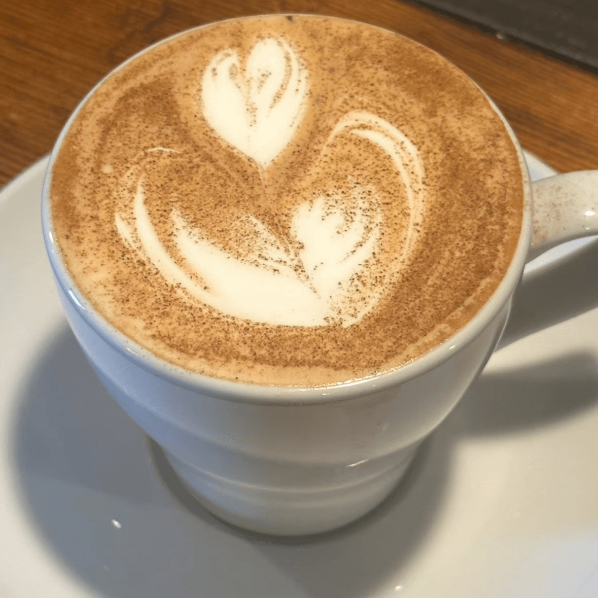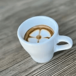 Fresh organic espresso with steamed milk, rose, and white chocolate
