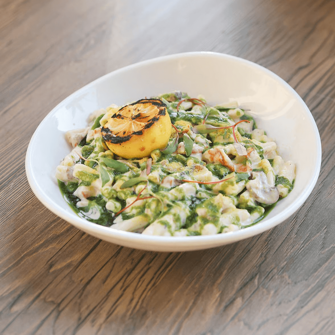 Organic strozzapreti pasta tossed in a silky house-made cashew cream sauce with local tomatoes, mushrooms, arugula, and caramelized onions, brightened with a touch of lemon zest. Gluten-free options available upon request