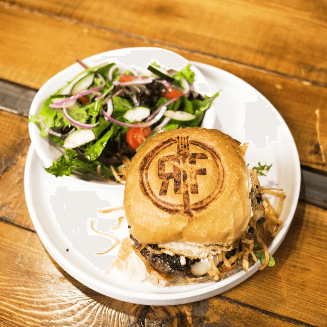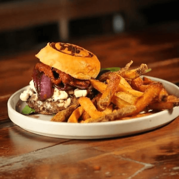 A half-pound, 100% grass-fed and finished beef patty with cheddar cheese, house-made caramelized onions, pickled Fresno chilis, and IPA aioli, served on a toasted Village Bread potato bun