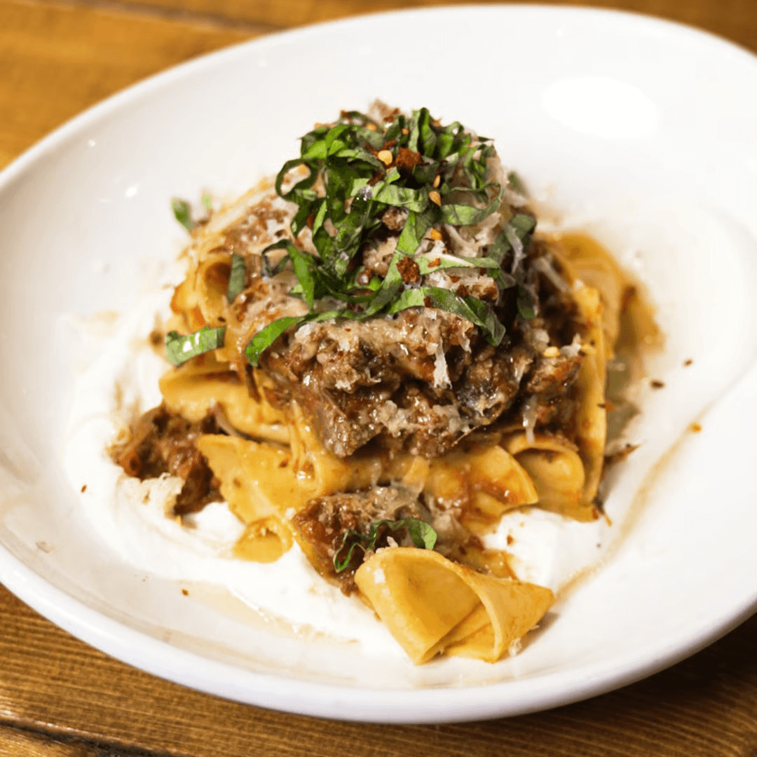 Tender, 100% grass-fed and finished braised short rib, slow-cooked in a rich Italian-style ragu, tossed with pappardelle. Served over a bed of whipped ricotta and finished with shaved Parmesan and fresh basil