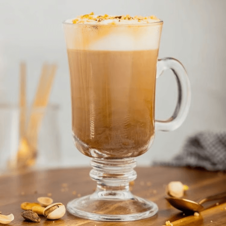 A creamy blend of smooth milk and rich espresso, enhanced by the sweet notes of white chocolate and the nutty fragrance of shredded pistachio