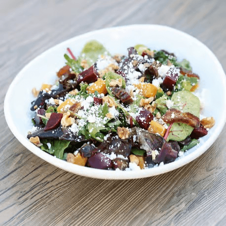 Organic spring mix topped with Drake Family Farms chèvre, roasted beets, sweet dates, and walnuts, finished with a blood orange pomegranate vinaigrette