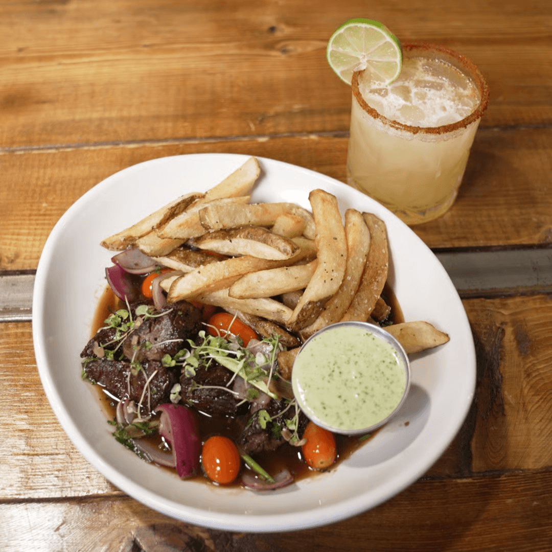 Five ounces of grass-fed Australian Wagyu sirloin BMS 7+ topped with Peruvian lomo saltado sauce, served over house fries, onions, and cherry tomatoes with a side of Forbidden black rice and aji verde sauce