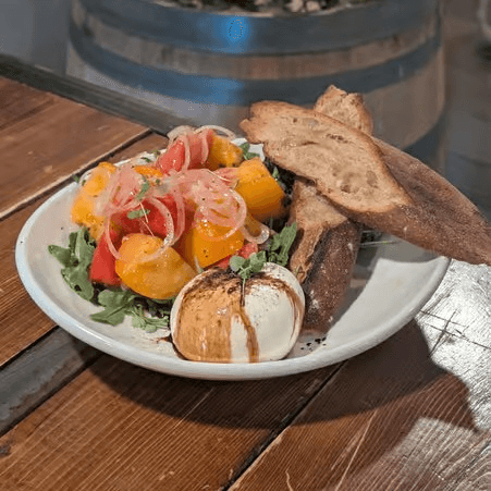Fresh and vibrant, this salad features 4 ounces of creamy burrata paired with organic roasted heirloom tomatoes and a bed of arugula. Served with toasted crostini, drizzled with basil oil, and finished with shallot pomegranate vinaigrette for a bright, balanced flavor