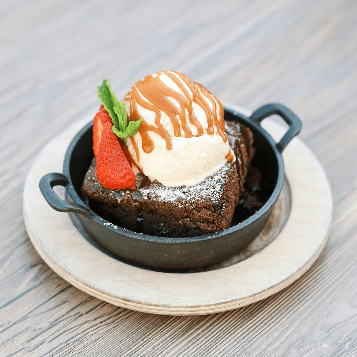 A rich, house-made, organic, gluten-free dark chocolate brownie served warm with organic vanilla ice cream, drizzled with bourbon caramel, and finished with a dusting of coconut