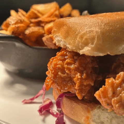 Crunchy Korean fried chicken tossed in a sweet and spicy gochujang honey glaze, served atop a vibrant slaw mix with a drizzle of zesty Asian dressing, and garnished with tangy pickled onions and pickled Fresno Chilis for the perfect balance of flavors and textures