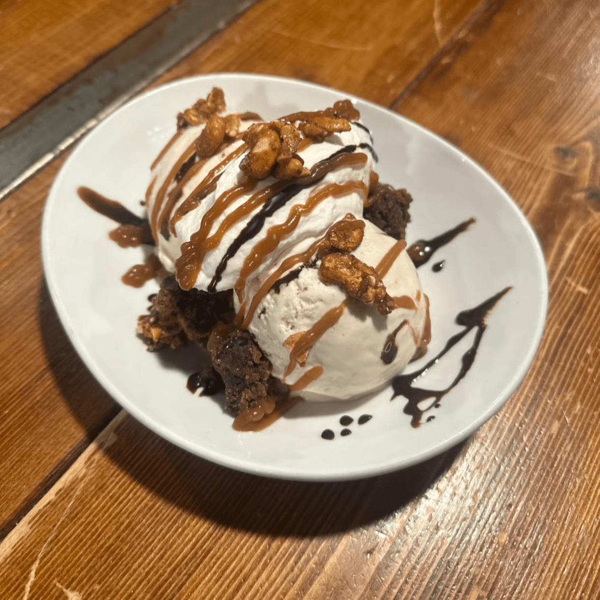 Two organic vanilla ice cream scoops, topped with candied cashews, a rich dark chocolate brownie, bourbon caramel, chocolate sauce, and whipped cream