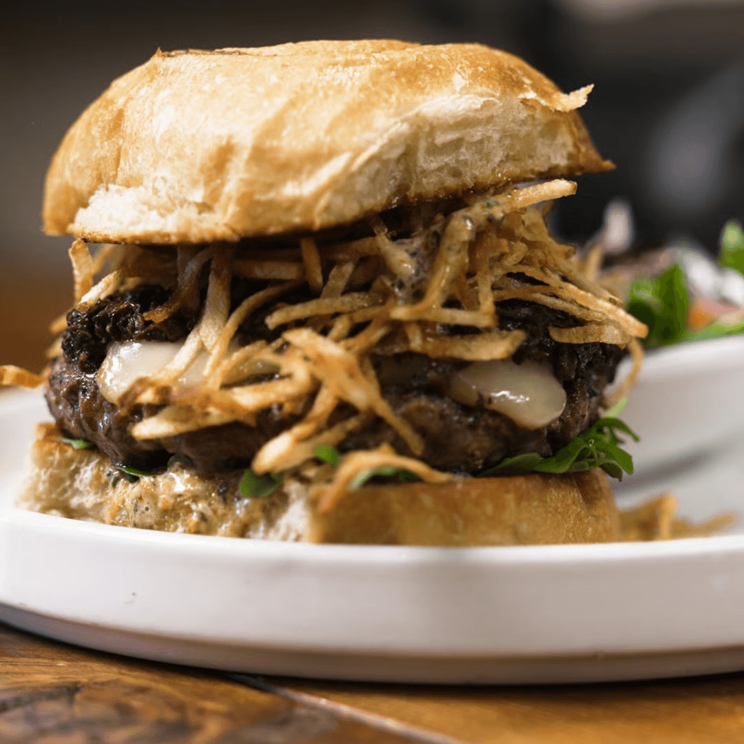 A half-pound, 100% grass-fed and finished beef patty layered with smoky Cheddar, savory grilled wild mushrooms, organic arugula, and our house-made chimichurri, crowned with crispy paille fries. Served with a crisp, refreshing side salad