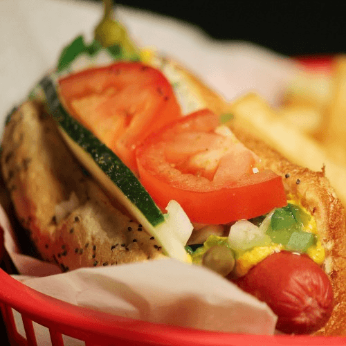 Mustard, relish, onion, cucumber, tomato, sport peppers and celery salt