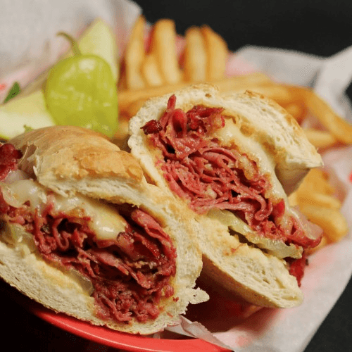 Garlic toasted roll with shaved roast beef, provolone and au jus
