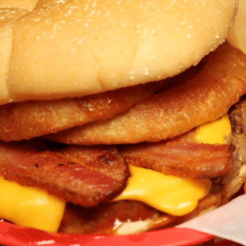 Half lb burger with American cheese, onion rings, pork belly and BBQ sauce